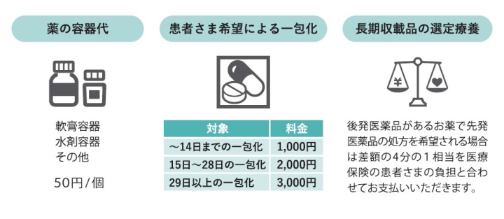 2024年10月1日より、当薬局では療養給付(健康保険から給付される医療費)と直接関係のない以下の項目においては、実費で負担をお願いしています。ご了承ください。